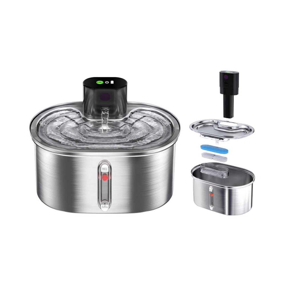 Product Features 304 Stainless Steel 3.5L Capacity Sensor /Interval Mode Dual-side Multi-layer Filtration Quiet Cordless Pump Product Parameters Water Capacity: 3.5L Pump: 5V1A (Quiet Cordless